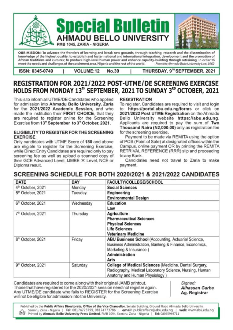 - Thirdly, candidates that fail to register or fill out the ABU Zaria admission screening form. Will not be eligible to write the Post UTME 2023/2024.